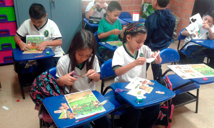 Los niños de la primaria de la Institución Educativa rural La Morena de Envigado, disfrutan de la campaña educativa de Mi primer Libro Animado: activan su motricidad recortando, armando y pegando cada uno de los escenarios que las entregas de estas campañas traen.